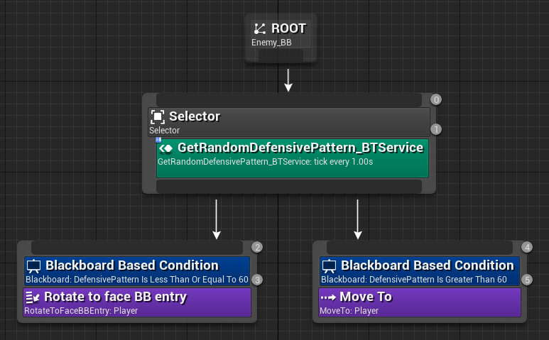 Sequence에 Service를 걸어두었는데, 이는 각 행동에 들어가기 전에 주사위를 굴려주는 역할을 한다. 즉, Offensive BT에 들어왔으면 60% 확률로 플레이어를 공격하고, 40% 확률로 후퇴한다. Defensive BT도 비슷하다. 60퍼센트 확률로 기다리고 40퍼센트 확률로 Offensive Area까지 접근한다.