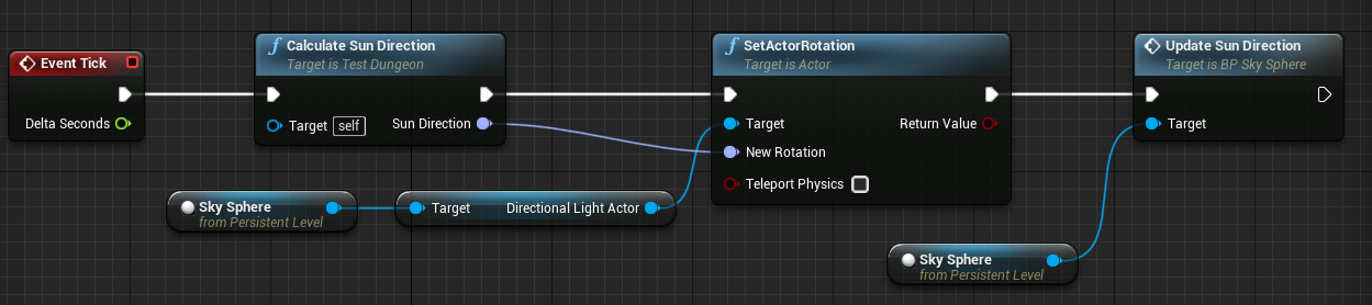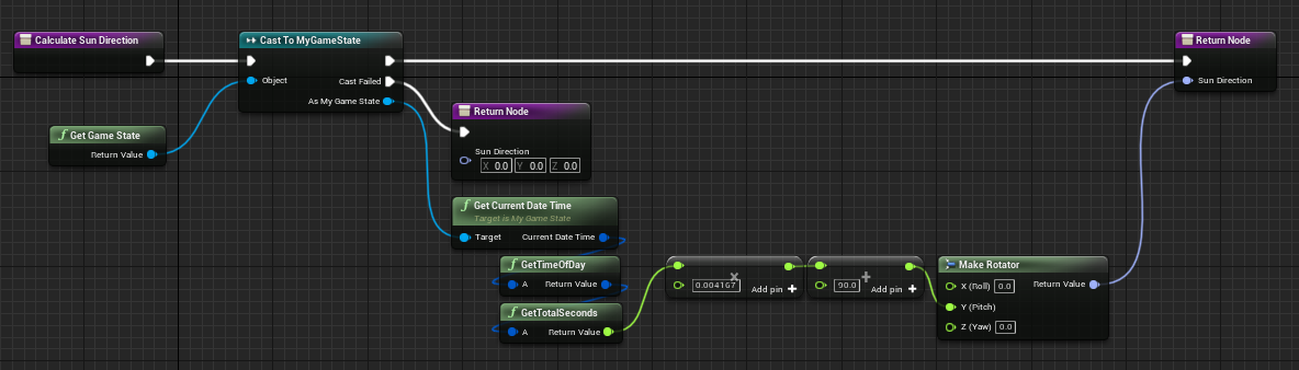 이 라이팅 액터를 런타임에 접근하려면 Level Blueprint여야 한다. Level Blueprint를 열고 함수 CalculateSunDirection을 추가한다. 해당 함수는 GameState로부터 현재 시간을 받아내서 이에 해당하는 해의 각도(FRotator)로 바꿔준다. 코드는 다음과 같다.