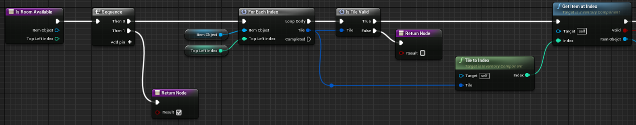 반복문이 4개나 있어서 헷갈리는데, 첫번째 for문은 인벤토리의 모든 칸에 대해 이 칸이 넣으려는 아이템의 가장 왼쪽 위 귀퉁이가 될 수 있는지 검사하는 것이다. 나머지 3개 for문은 이 과정에서 이 아이템의 모든 칸이 다른 아이템의 어떤 칸과도 겹치지 않는다는 것을 검사하는 것이다.